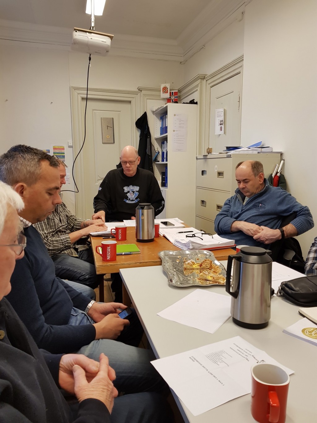 Da er det nye styret godt i gang med sitt arbeide som man kan se av bilde.